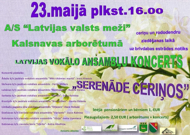 Ieejas maksa: 1.00 € pensionāriem un bērniem, 2.50 € pieaugušajiem (arborētums + koncerts)