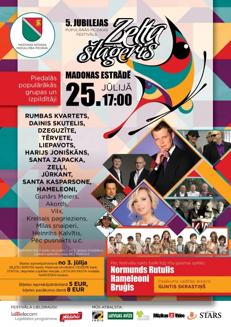25.jūlijā pulksten 17 Madonas estrādē notiks jau piektais populārās mūzikas festivāls „ZELTA ŠLĀGERIS 2015”, kurā uzstāsies Latvijā populārākie šlāgermūzikas un populārās mūzikas izpildītāji: Rumbas kvartets, Dainis Skutelis, Tērvete, Liepavots, Harijs Joniškāns, Santa Zapacka, Zeļļi, Jūrkant, Santa Kasparsone, Hameleoni, Gunārs Meijers, Akords, Vilx, Kreisais pagrieziens, Mīlas snaiperi, Heinrihs Kalvītis, Pēc pusnakts un citi.