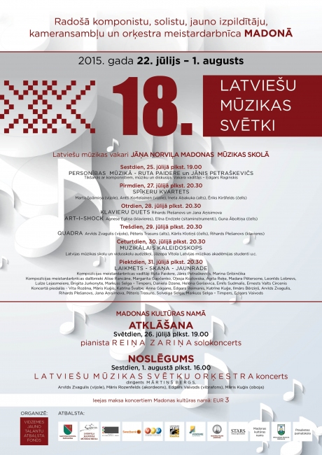 Jau 18. reizi Madonā izskanēs Latviešu mūzikas svētki, ievērojama un unikāla iezīme Latvijas kultūras panorāmā. Jau no 22.jūlija vakara Jāņa Norviļa Madonas mūzikas skola tiks „apdzīvota” ar jaunajiem komponistiem un viņu meistardarbnīcas vadītājiem. Individuālās nodarbības, lekcijas Rutas Paideres, Jāņa Petraškeviča, Rolanda Kronlaka, Andra Dzenīša, Gundegas Šmites, Māra Kuģa, Annas Gāganes vadībā, kā arī radoša atmosfēra slīpējot, eksperimentējot, meklējot - tā vienā teikumā varētu noraksturot komponistu darbošanos Madonā. Sākot ar 27.jūliju Madonā skanēs, dunēs, virmos daudzu jauno mūziķu soļi, viņu instrumentu skaņas, jautras čalas, darbīga atmosfēra, jo arī mazajiem būs dažādas meistardarbnīcas - topošajiem komponistiem Marinas Gribinčikas vadībā, instrumentālistiem Riharda Plešanova, Martas Spārniņas, Arvīda Zvaguļa, Pētera Trasuna, Kārļa Klotiņa, Vitas Rozēnas, Hansa Bloka vadībā, kā arī orķestra nometne Mārtiņa Berga vadībā.