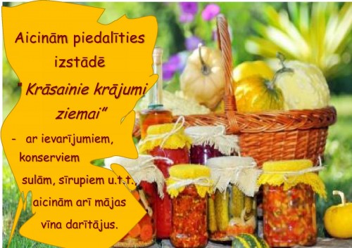 "Krāsainie krājumi ziemai" - krāsaino salātu burciņu izstāde. Saimnieces tiek aicinātas piedalīties ar saviem krājumiem.