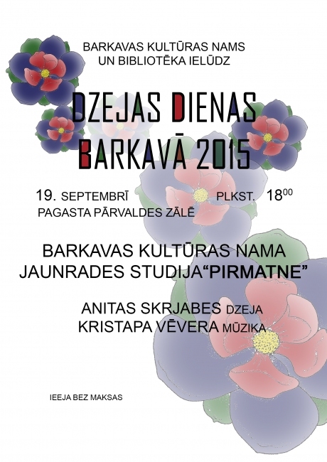 Barkavas kultūras nams un bibliotēka ielūdz uz DZEJAS DIENĀM BARKAVĀ 2015 pagasta pārvaldes zālē. Barkavas kultūras nama JAUNRADES STUDIJA “PIRMATNE” - Anitas Skrjabes dzeja, Kristapa Vēvera mūzika.