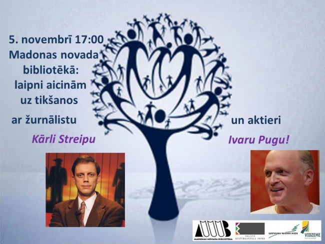 Aicinām jūs uz trešo sarunu vakaru, īstenojot Madonas novada bibliotēkas projektu „Sarunu vakari Madonas novada bibliotēkā: Mēs tiekamies piektajā piecos” - atbalsts gūts projektu konkursā, kuru izsludināja un administrēja Vidzemes plānošanas reģiona „Latvijas valsts mežu” atbalstītā Vidzemes kultūras programma 2015”. Šoreiz pie mums viesos būs Latvijas Nacionālā teātra aktieris Ivars Puga un Latvijas Radio un TV žurnālists Kārlis Streips. Arī piecdesmitpiecgadnieki, dažādu nozaru pārstāvji, kas dzīvo vienā laikā, ir spējuši kļūt atpazīstami, savus 55 gadus ir radoši piepildījuši un turpina strādāt. Katra stāsts ir unikāls. tādēļ ir vērts par to runāt. Mans laiks + mans stāsts + mana pieredze = kultūrvēsture.