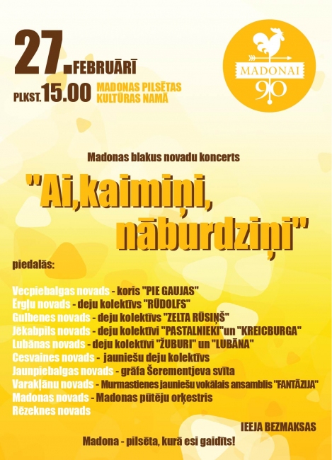 Aicināti visi uz koncertu ar mūsu kaimiņiem - bērnu deju kolektīvu „Pastalnieki” un vidējās paaudzes deju kolektīvu „Kreicburga” - Jēkabpils, jauktais koris „Pie Gaujas” - Vecpiebalga, deju kolektīvs „Ŗūdolfs" - Ērgļi, deju kolektīvi „Žuburi" un „Lubāna" - Lubāna, Cesvaines kultūras nama jauniešu deju kolektīvs, grāfa „Šeremetjeva svīta” no Jaunpiebalgas, jauniešu vokālais ansamblis „Fantāzija” no Murmastienes - Varakļānu novads, Maltas lauku kapella - Rēzeknes novads.