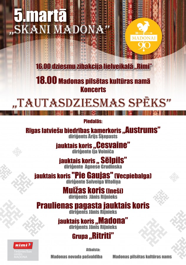 pulksten 18:00 koncertā "TAUTASDZIESMAS SPĒKS" Madonas pilsētas kultūras namā kopā ar 7 koriem no Madonas, Praulienas, Cesvaines, Sēlpils, Taurenes, Inešiem un Rīgas. Savu tautasdziesmu interpretējumu dzirdēsim jaunās grupas „Ritriti” izpildījumā Silvestra Sīļa vadībā. Savukārt Agris Vanags ļaus mums iepazīties ar savām „Spēka stājām”.