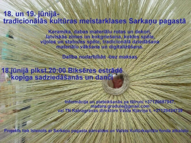 18.jūnija pulksten 20:00 visi būs mīļi gaidīti uz kopīgu sadziedāšanos un sadancošanos Biksēres estrādē.Projekts tiek īstenots ar Sarkaņu pagasta pārvaldes un Valsts Kultūrkapitāla fonda atbalstu.