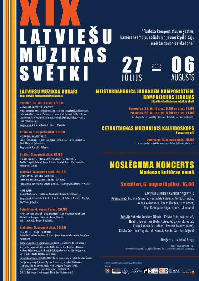 Sestdien, 6.augustā pulksten 16:00 Latviešu mūzikas svētku orķestra sniegumā noslēguma koncerts diriģenta Mārtiņa Berga vadībā. Programmā Imanta Zemzara, Romualda Kalsona, Arvīda Žilinska, Annas Veismanes, Ilonas Breģes, Jāņa Ivanova u.c. skaņdarbi. Koncerta solisti - Roberta Kumsāre (flauta), Krista Fadejeva (balss), Renārs Tomašickis (balss), Anna Gāgane (klarnete), Elvijs Endelis (ksilofons), Pēteris Trasuns (alts).