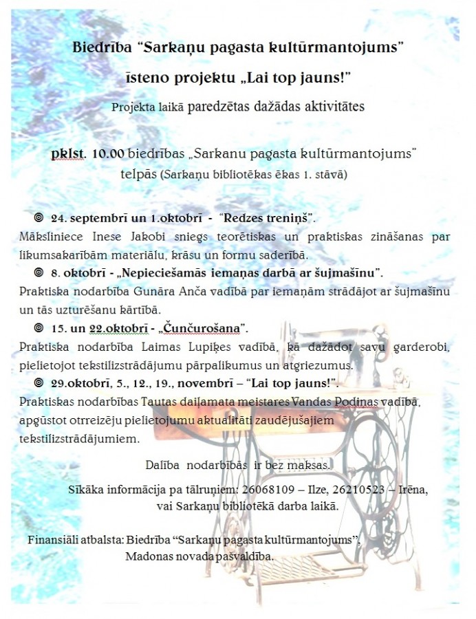 Informāciju iesūtīja: biedrības “Sarkaņu pagasta kultūrmantojums" projekta "Lai top jauns!" vadītāja Ilze Pliska.