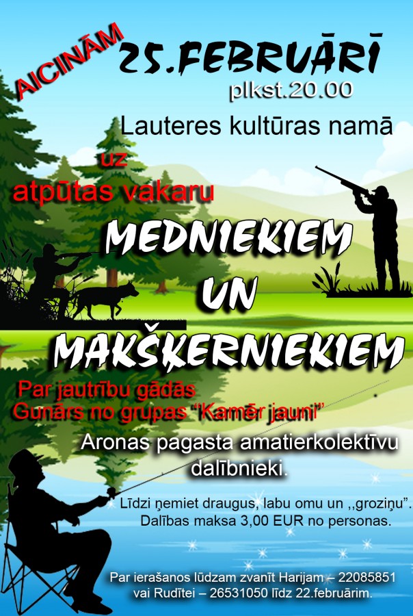 Lauteres kultūras namā, Aronas pagastā 25.februārī pulksten 20:00.Dalības maksa 3.00 EUR no personas un ,,groziņš”.