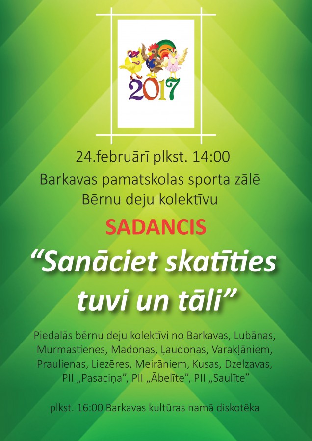 Pulksten 14:00 Barkavas pamatskolas sporta zālēBērnu deju kolektīvu SADANCIS „Sanāciet skatīties tuvi un tāli!”.