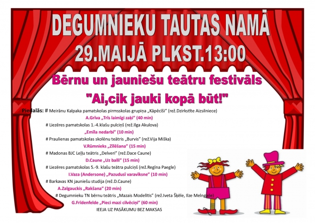 Bērnu un jauniešu teātru festivālā “Ai, cik jauki kopā būt!” piedalās:Meirānu Kalpaka pamatskolas pirmsskolas grupiņa „Kāpēcīši” (rež. Dzirkstīte Aizsilniece) - A.Grīva „Trīs laimīgi zaķi” (40 min);