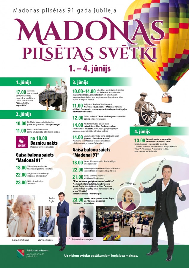 Gaisa balonu saiets "Madonai 91" - vakara lidojums (atcelts nelabvēlīgu laika apstākļu dēļ);pulksten 22:00 cauri Madonas pilsētaiGaisa balonu saiets "Madonai 91" - Degļu šovs (karte pielikumā)