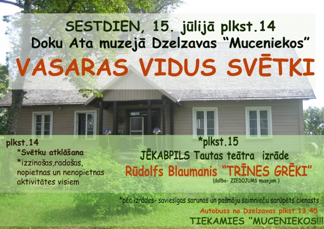 Uz tikšanos 15.jūlijā pulksten 14:00 Vasaras vidus svētkos Doku Ata “Muceniekos”!Informāciju iesūtīja: Dzelzavas kultūras nama direktore Dace Kalniņa.