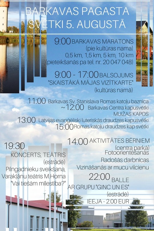 9:00 BARKAVAS MARATONS pie kultūras nama - 0,5 km, 1,5 km, 5 km, 10 km (pieteikšanās pa tel.nr. 20 047 048);