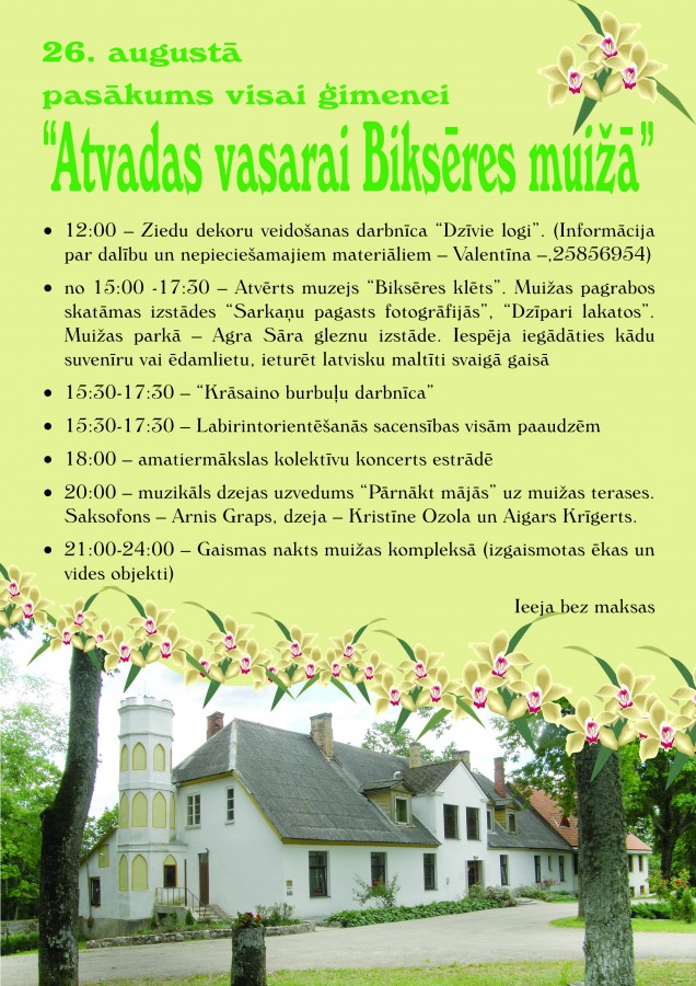 pulksten 20:00 - Muzikāls dzejas uzvedums “Pārnākt mājās” uz muižas terases.