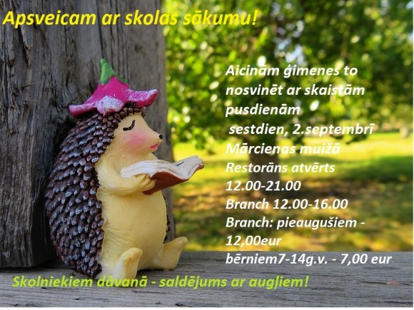 SPA kūrortā un viesnīcā "Mārcienas muiža" 2.septembrī no pulksten 12:00.Brančā būs plašs auksto, otro ēdienu un deserta piedāvājums, skolniekiem - dāvinām īstu saldējuma sapni!