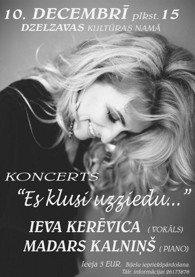 Dzelzavas kultūras namā ar koncertu „Es klusi uzziedu….” viesosies dziedātāja Ieva Kerēvica un džeza pianists Madars Kalniņš. Izskanēs Madara un Ievas oriģinālkompozīcijas un dažādas interpretācijas, būs tuvojošos balto Ziemassvētku noskaņas.