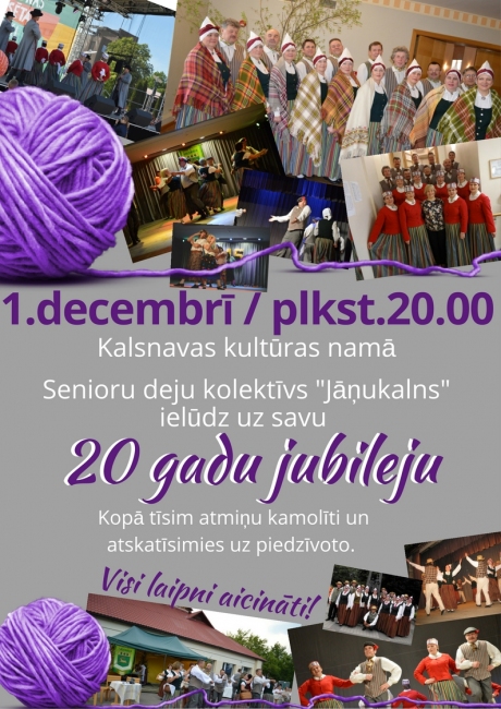 Senioru deju kolektīvs “Jāņukalns” ielūdz uz savu 20 gadu jubileju. Tiks izdejotas 20 gades labākās dejas, kopīgi attīts atmiņu kamolītis un tā spilgtākie mirkļi. Aicināti vecie dejotāji un kolektīva daiļrades cienītāji. Visi laipni aicināti!