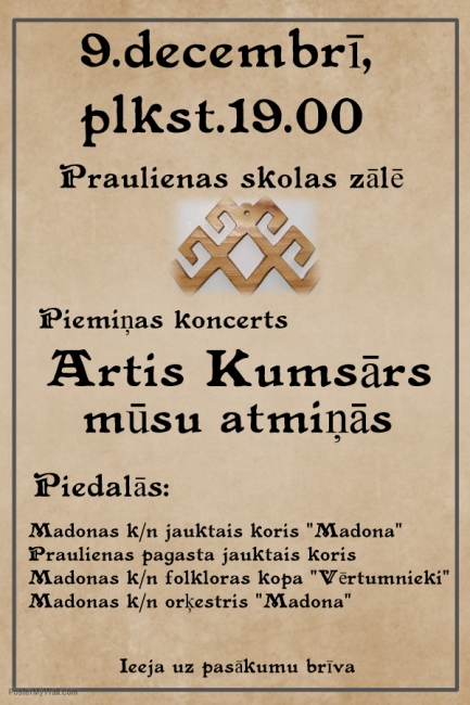 Mūsu novadniekam, Latvijas dižvīram, folkloristam un diriģentam Artim Kumsāram, šogad apritētu 75 gadi. Piemiņas pasākumā, kurš veltīts Artim Kumsāram, piedalīsies Praulienas pagasta jauktais koris, jauktais koris „Madona”, Madonas kultūras nama pūtēju orķestris, folkloras kopa „Vērtumnieki”.