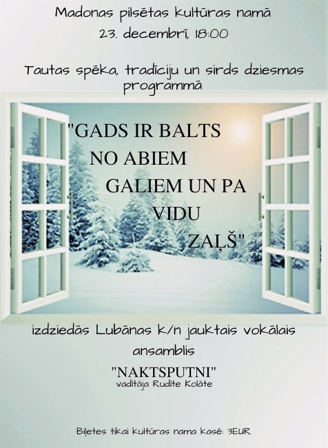 Madonas pilsētas kultūras namā 23.decembrī pulksten 18:00.Biļetes cena: 3.00 EUR.