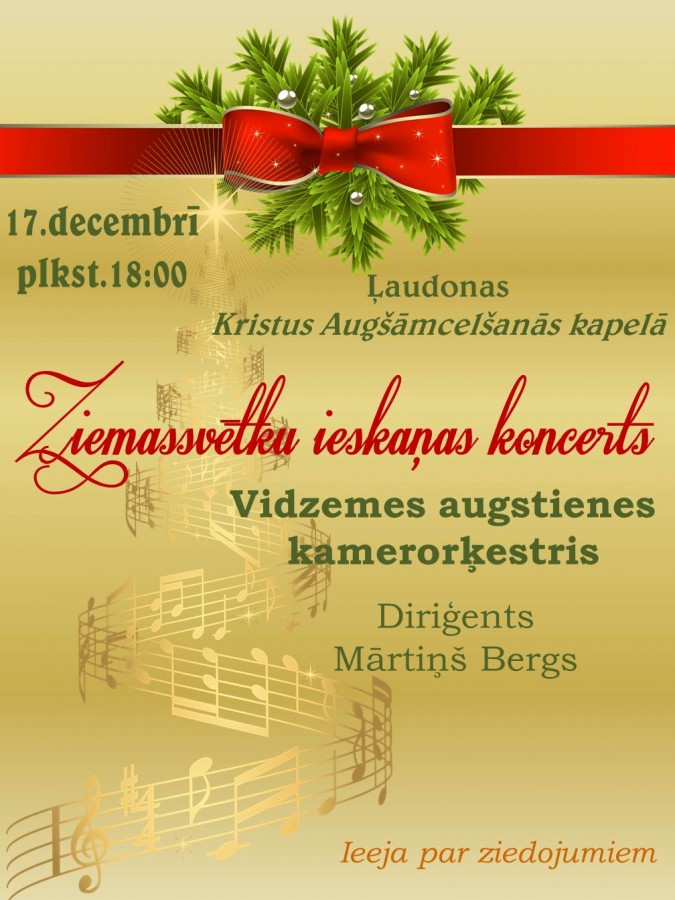 Ļaudonas Kristus augšāmcelšanās kapelā 17.decembrī pulksten 18:00. Ieeja par ziedojumiem (ziedojumi kapelas jumta atjaunošanai).