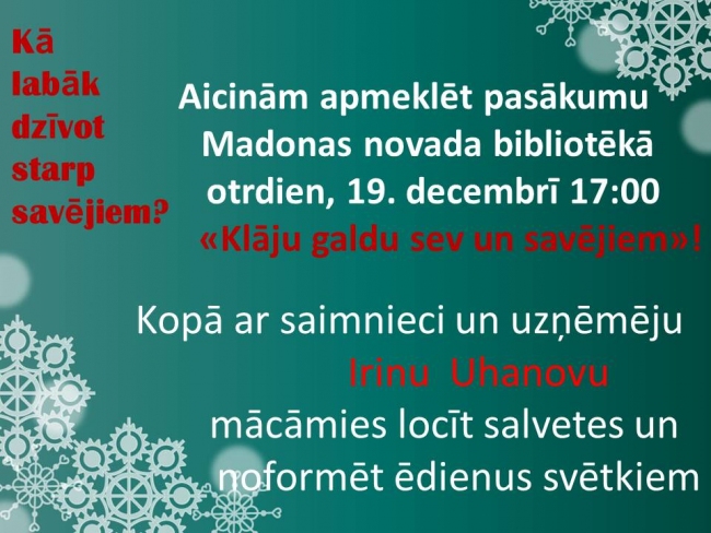 Madonas novada bibliotēkā 19.decembrī pulksten 17:00.Ieeja bez maksas.