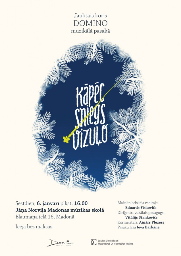 Uz muzikālu un literāru tikšanos 6.janvārī pulksten 16:00 mūzikas skolas Laimas zālē koris “Domino” aicina gan tos klausītājus, kuri iepazina šo muzikālo kolektīvu koncertā rudenī, gan visus pārējos interesentus - bērnus un pieaugušos, kuri vēlas rast atbildi uz M.Stārastes pasakā uzdoto jautājumu: ,,Kāpēc sniegs vizuļo?”.
