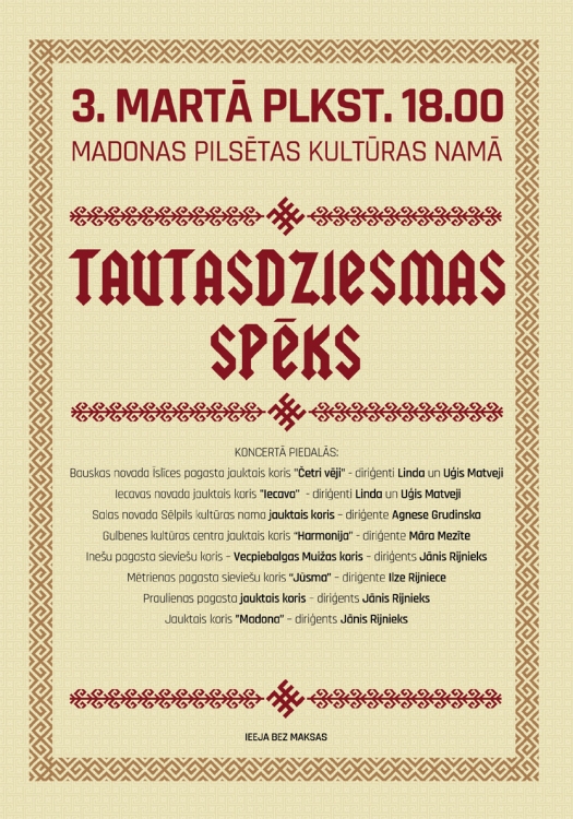 Madonas pilsētas kultūras namā 3.martā pulksten 18:00.