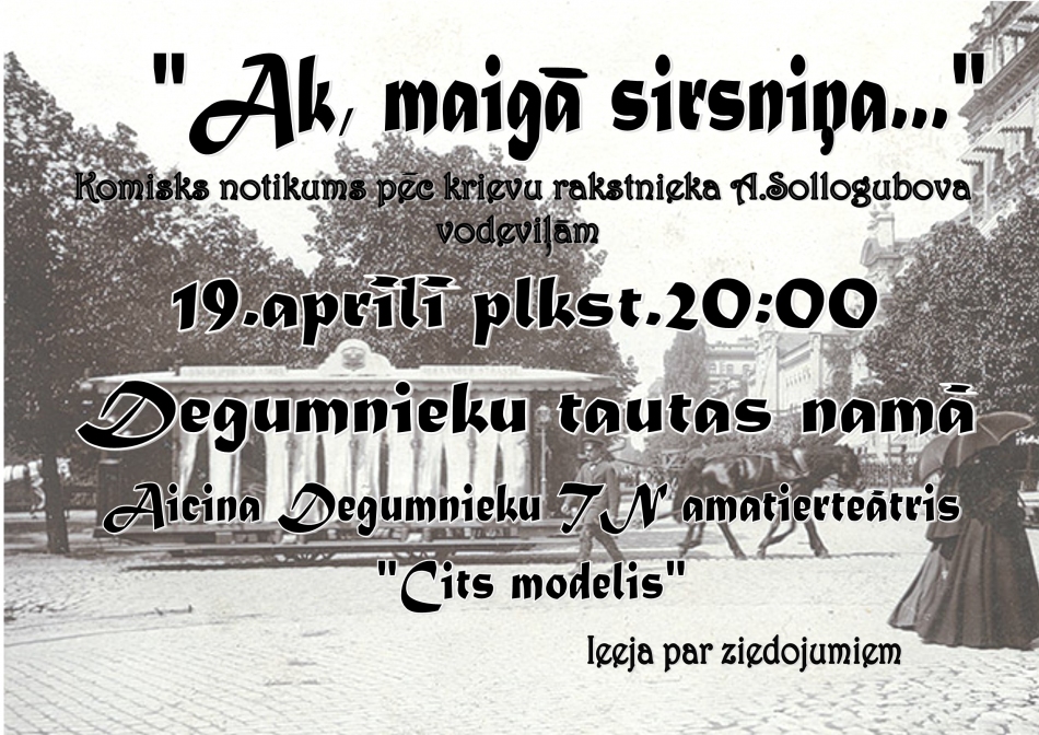 Degumnieku tautas namā 19.aprīlī pulksten 20:00.