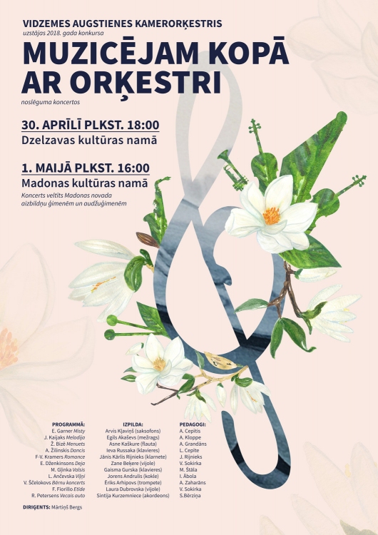 Dzelzavas kultūras namā koncertēs Vidzemes augstienes kamerorķestris Mārtiņa Berga vadībā un 11 Madonas mūzikas skolas audzēkņi - konkursa „Muzicējam kopā ar orķestri” laureāti. Gaidīti visi interesenti!