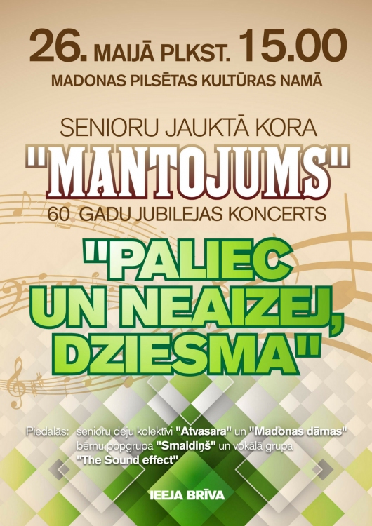 Madonas pilsētas kultūras namā 26.maijā pulksten 15:00.