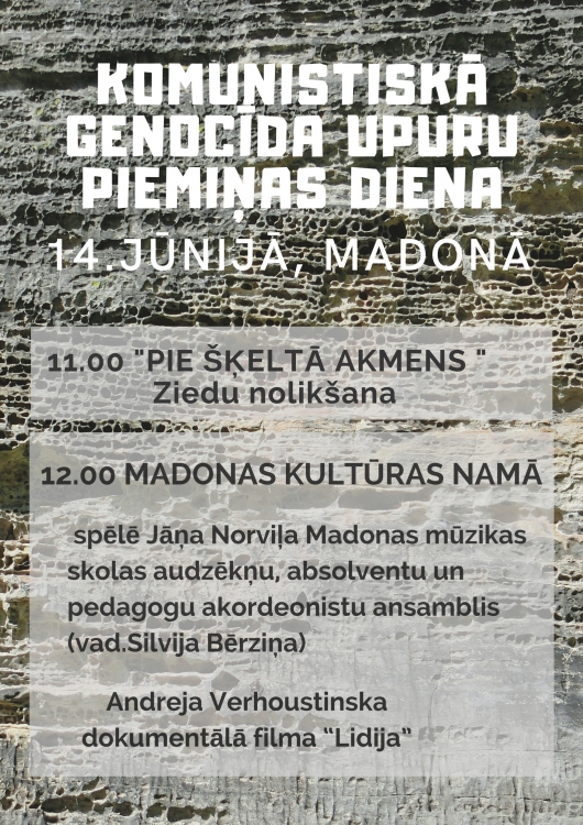 Pulksten 12:00 Madonas pilsētas kultūras namā muzikāls veltījums Jāņa Norviļa Madonas mūzikas skolas audzēkņu, absolventu un pedagogu akordeonistu ansambļa izpildījumā (vadītāja Silvija Bērziņa). Turpinājumā dokumentālā filma "Lidija" (režisors Andrejs Verhoustinskis). Filmā caur Lidijas mūžu parādīts visas Latvijas tautas ceļš. Cilvēka seja, viņa acis glabā pieredzi labāk nekā jebkurš dokuments vai pierakstīts atmiņu stāstījums. Īpaši, ja šis cilvēks ir tik daudz piedzīvojis kā Lidija Lasmane-Doroņina...