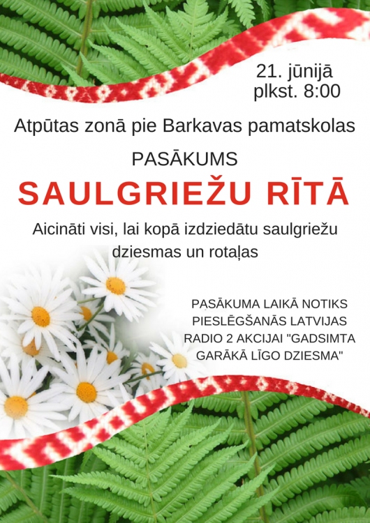 Vasaras saulgriežu ieskandināšana Barkavā atpūtas zonā pie Barkavas pamatskolas no pulksten 08:00 līdz 09:00.