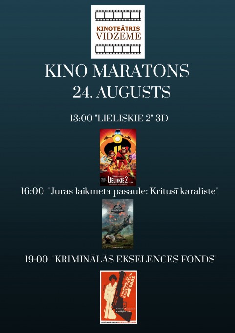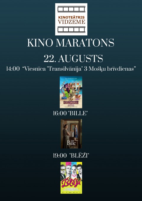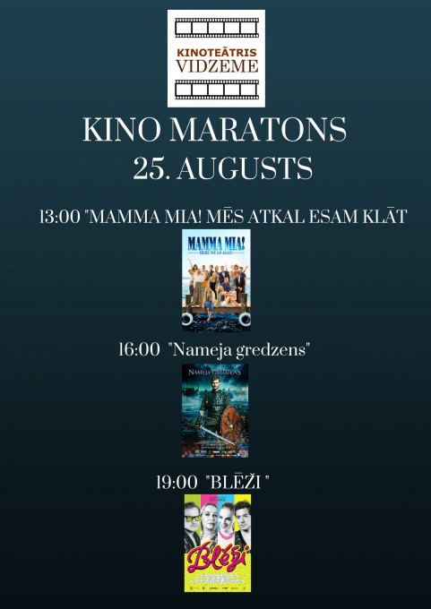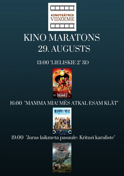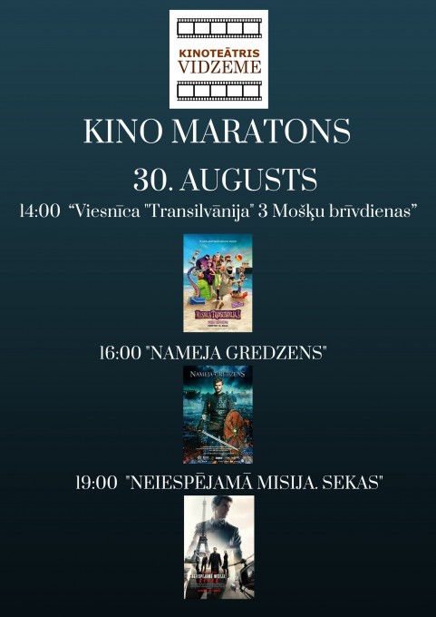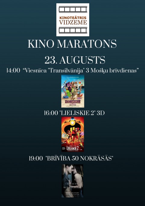 “Kino maratona” laikā būs iespējams noskatīties animācijas filmas “Viesnīca “Transilvānija” 3 : Mošķu brīvdienas” un “Lieliskie 2”, filmu programmas “Latvijas filmas Latvijas simtgadei” ietvaros uzņemto ģimenes filmu “Bille”, populāro latviešu vēsturisko drāmu “Nameja gredzens”, slavenās triloģijas noslēguma filmu “Brīvība 50 nokrāsās”, jaunākās latviešu komēdijas “Blēži” un “Kriminālās ekselences fonds”, kā arī aktuālās filmas “Juras laikmeta pasaule: Kritusī karaliste”, “Neiespējamā misija: Sekas” un pašu jaunāko mūziklu “Mamma Mia: Mēs atkal esam klāt”. Ir iespējamas arī tikšanās ar filmu veidotājiem.