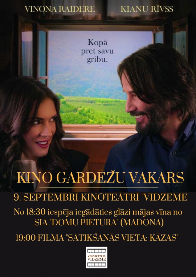 Svētdien jau no pulksten 18:30 ikviens būs gaidīts kinoteātrī, lai pirms filmas sākuma iegādātos un, atveldzējot dvēseli, nobaudītu kādu glāzi vīna darītavas SIA “Domu pietura” (Madona) gatavotā mājas vīna, un pulksten 19:00 ļautos stāstam par divu vientuļnieku tikšanos Viktora Levina (Victor Levin) filmā “Satikšanās vieta: Kāzas” (Destination wedding) 2018 ar spožu aktieru komandu - Vinonu Raideri (Winona Ryder) un Kianu Rīvzu (Keanu Reeves) galvenajās lomās. Filmu piedāvā Acme Film SIA.