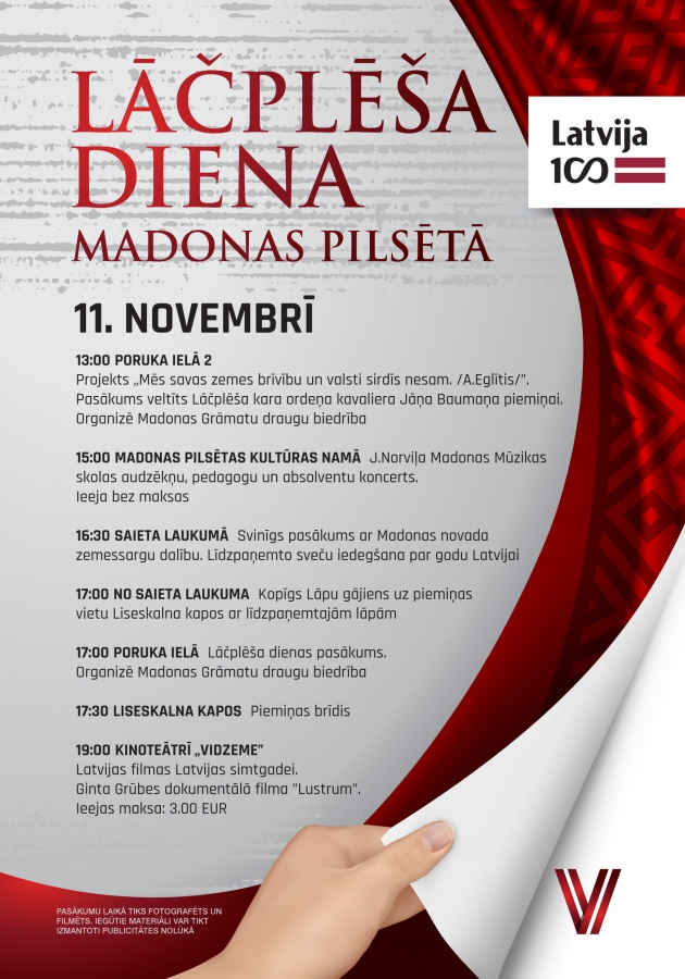 17:00 Poruka ielāLāčplēša dienas pasākums.Organizē Madonas Grāmatu draugu biedrība.