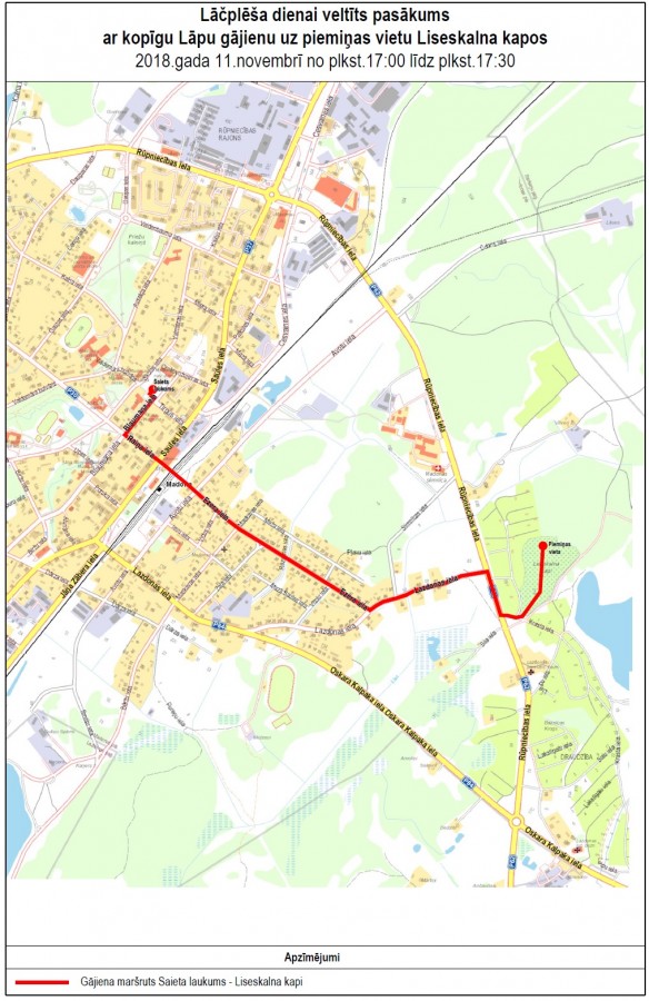 Maršŗuts: Saieta laukums - Blaumaņa iela - Raiņa iela - Raiņa un Saules ielas krustojums - dzelzceļa pāreja - Ezera iela - Lazdonas iela - Rūpniecības iela - piemiņas vieta Liseskalna kapos.