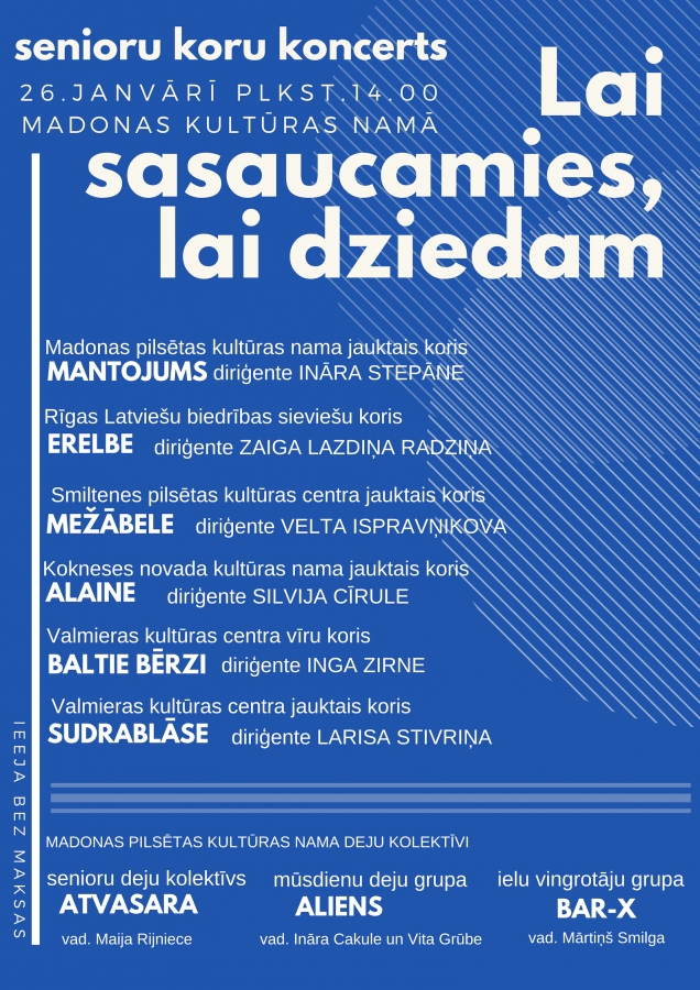 Sestdien, 26.janvārī, Madonas pilsētas kultūras namā tiksies un kopīgi ieskandinās zāli un jauno gadu ar dziesmām jauktais koris "Mantojums" un viņu dziedošie draugi: senioru kori "ERELBE" - Rīgas Latviešu biedrības sieviešu koris, "Mežābele" - Smiltenes pilsētas kultūras centra jauktais koris, "Alaine" - Kokneses novada kultūras nama jauktais koris, "Baltie bērzi" - Valmieras kultūras centra vīru koris, "Sudrablāse" - Valmieras kultūras centra jauktais koris. Par deju soli rūpēsies Madonas senioru kolektīvs "Atvasara", mūsdienu deju grupas "Aliens", dejotāja Estere Līna Rozniece. Savukārt vīrišķīgu dzirksteli piešķils ielu vingrotāju grupa "BAR-X".
