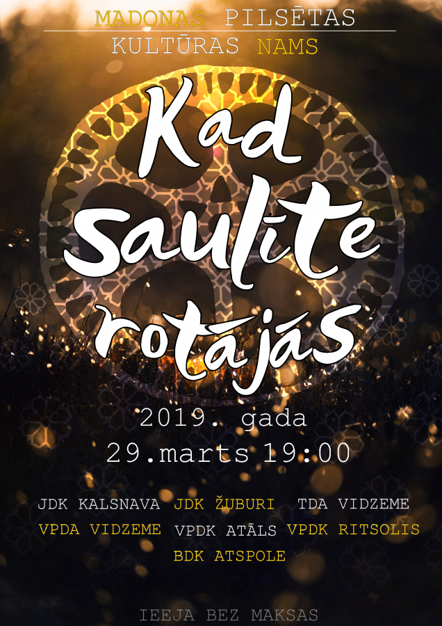 Koncerts Madonas pilsētas kultūras namā “Kad saulīte rotājas” , kurā izdejots tiks saules gada rits un ar to saistītie svinamie laiki. Astoņas galvenās latviskās gadskārtas, kas nosaka cilvēka, sabiedrības, dabas un arī lielā Visuma rita savstarpējo mijiedarbību.