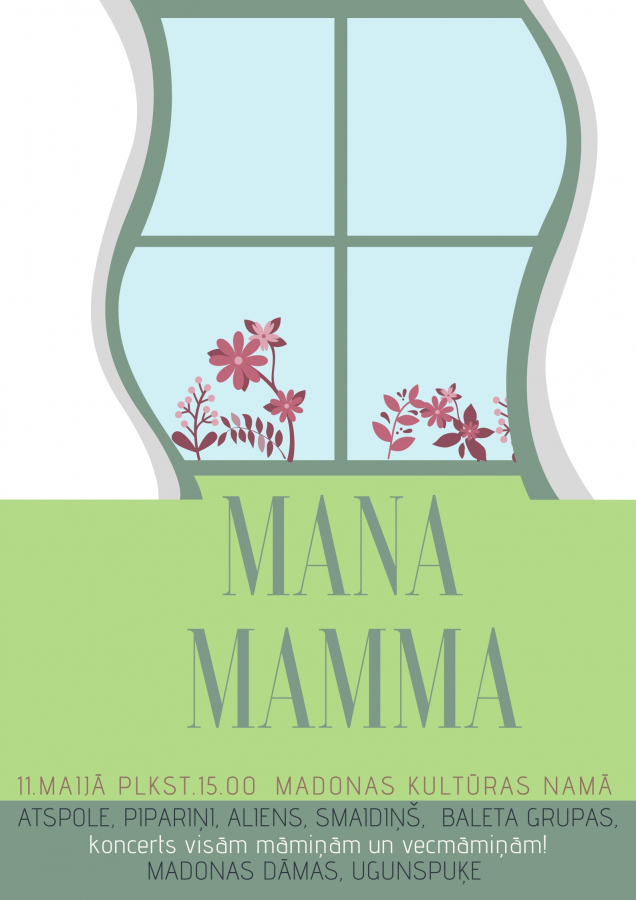 11.maijā plkst.15.00 Madonas kultūras namā dāvāsim savām māmiņām un vecmāmiņām mazu sirsnīgu paldies ar dziesmām un dejām. Domāsim un teiksim labos vārdus, dažādas atmiņas un domu graudus. Aicināsim pievienot katram savu atziņu kolāžā “Mana mamma ir …”