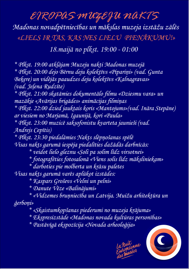 Ar Muzeju nakts programmu aicinām iepazīties zemāk pievienotajos publicitātes attēlos, kā arī Madonas muzeja mājas lapā www.madonasmuzejs.lv un sociālajā tīklā www.facebook.com/muzejsmadona
