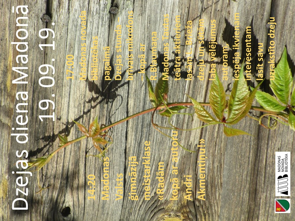 17:00 - Dzejas stunda - brīvais mikrofons Madonas novada bibliotēkas pagalmā. Laipni aicinām rakstošos un lasošos iesaistīties Dzejas dienas aktivitātēs, jo Dzejas stundu ievadīs R. Blaumaņa Madonas Tautas teātra aktieri, lasot L. Brieža dzeju, tad dosim iespēju ikvienam atšķirt kādu no autora grāmatām un nolasīt dzejoli, kas tieši tajā mirklī jūs būs uzrunājis. Tā sūtīsim labas veselības vēlējumus un dzejas vārdus kopā ar rudens vēju mūsu novadniekam L. Briedim. Dzeja - tās ir noskaņas, sajūtas, acumirkļi, ceļojums laikā un telpā, neatbildētie un nekad arī neatbildamie jautājumi, sevis izzināšana un pašapliecināšanās.