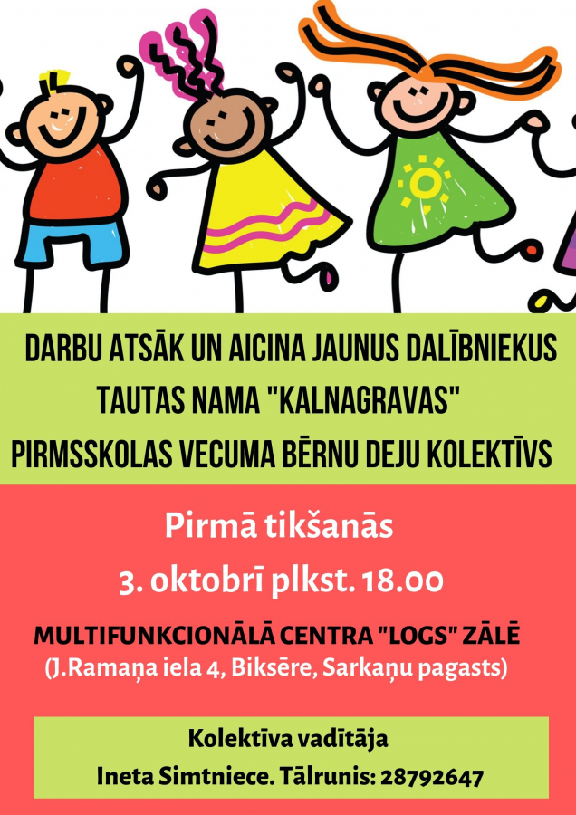 Darbu atsāk tautas nama “Kalnagravas” pirmsskolas vecuma bērnu deju kolektīvs. Aicināti visi mazie dejotgribētāji no 3 gadu vecuma.