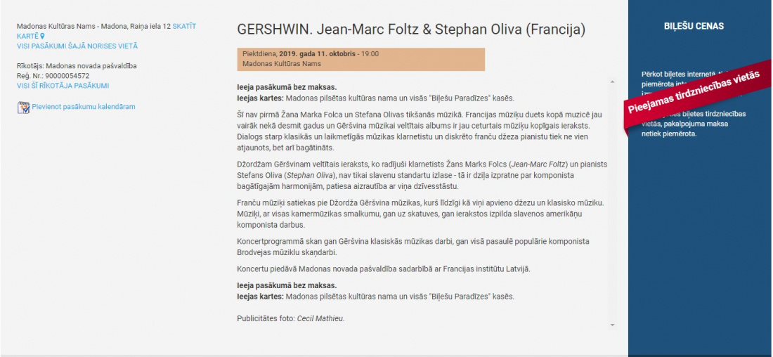 Žana Marka Folca un Stefana Olivas (Francija) koncertprogrammas “GERSHWIN” apmeklējums ir bez maksas, uzrādot bezmaksas ieejas karti. Līdz šim, iespēja izņemt bezmaksas ieejas kartes uz Madonas pilsētas kultūras namā notiekošajiem pasākumiem pastāvēja tikai kultūras nama kasē.