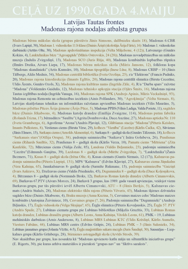 Padomes “Deklarāciju jautājumā par Latvijas valstisko neatkarību” par valsts oficiāliem simboliem tika atzīti Latvijas ģerbonis, sarkanbaltsarkanais karogs un himna “Dievs, svētī Latviju!”. 26. februārī Latvijas Tautas Frontes Madonas nodaļas valdes sēdē nolēma 18.martā plānotajām Latvijas PSR Augstākās Padomes vēlēšanas ieteikt atbalstīt šādus deputātu kandidātus: Eduardu Berklavu (Madonas vēlēšanu apgabals) Jāni Gavaru (Cesvaines vēlēšanu apgabals), Valdi Šteinu (Ērgļu vēlēšanu apgabals); Ignatu Ķemzānu un Pēteri Krūgaļaužu (Varakļānu vēlēšanu apgabals). 18. martā Augstākās Padomes vēlēšanās Latvijas Tautas frontes un neatkarības atbalstītāji ieguva mandātu vairākumu no 201 deputātu vietas.