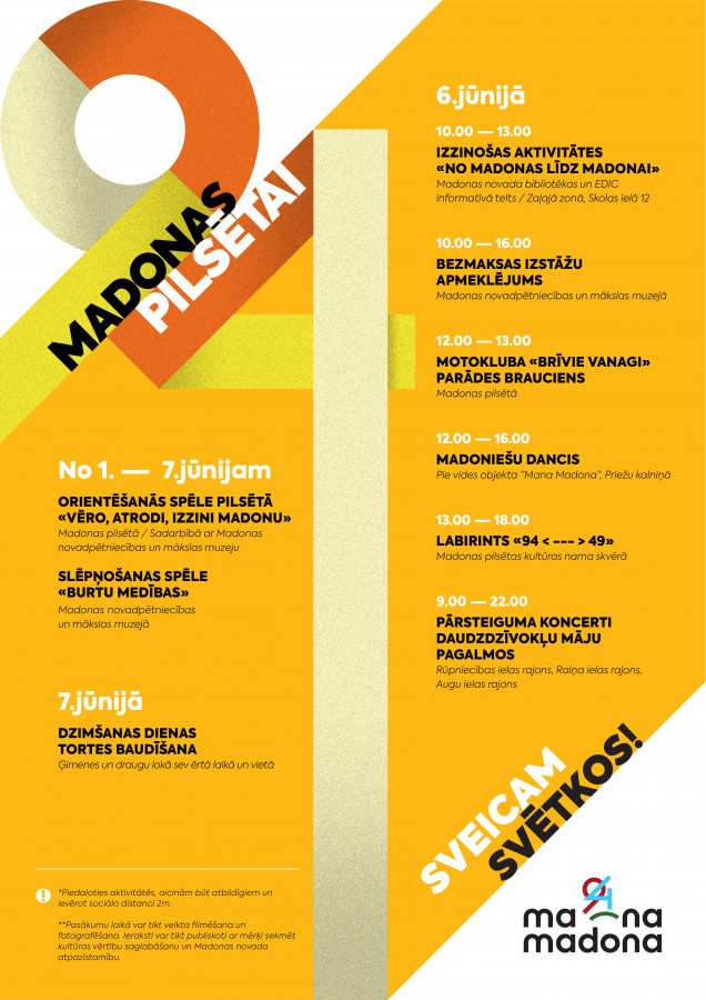 Visas svētku nedēļas garumā no 1. līdz 7. jūnijam Madonas novadpētniecības un mākslas muzejs piedāvās Orientēšanās spēli pilsētā “Vēro, atrodi, izzini Madonu”. Spēles ietvaros būs jāsameklē 15 vēsturiskas un mūsdienu vidi raksturojošas detaļas, kurām ikdienā paskrienam garām. Pilsētas svētku nedēļā muzeja un Madonas novada pašvaldības mājas lapā būs lejupielādējama darba lapa ar 15 uzdevumiem. Izdrukā lapu, doties sev tīkamā laikā iepazīt pilsētu un meklē atbildes.