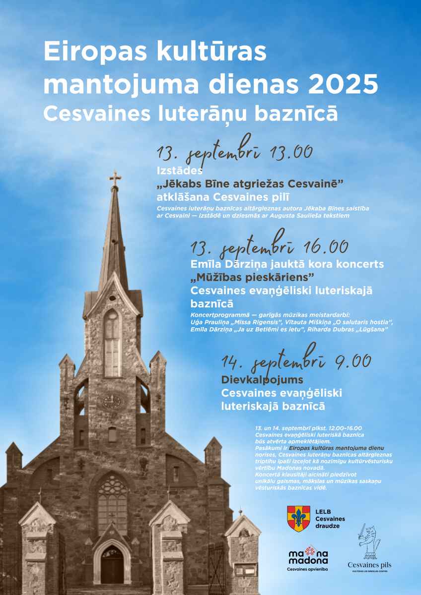 Šogad, 13. -14. septembrī, Cesvaine aicina uz Eiropas kultūras mantojuma dienām, kuru programmā paredzēti gan mākslas, gan garīgās mūzikas notikumi.