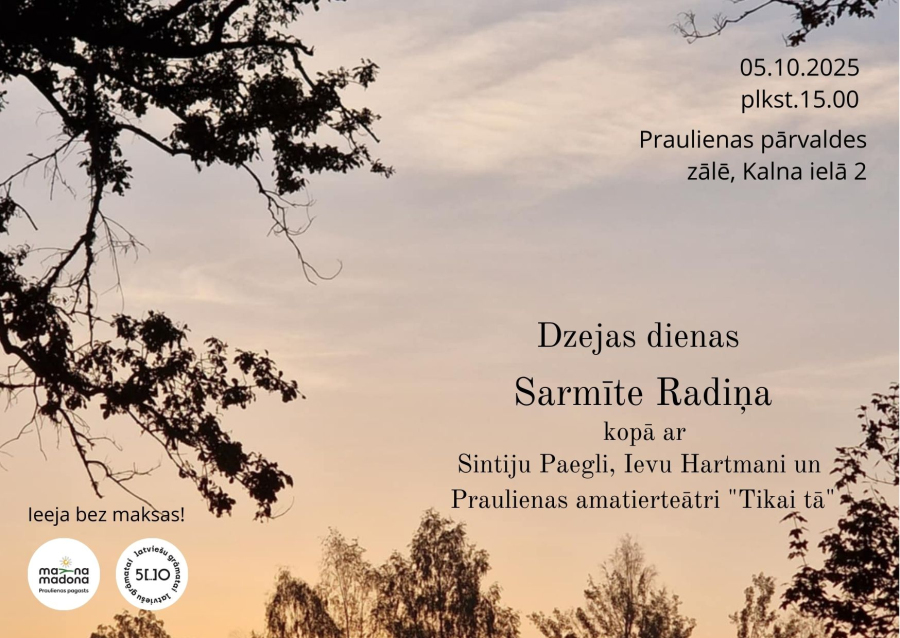 Praulienas pagasta bibliotēka sadarbībā un Saikavas tautas namu aicina uz Dzejas dienu pasākumu, lai tuvāk iepazītu dzejnieci un viņas dzeju - gan Sarmītes, gan Praulienas amatierteātra “Tikai tā” dalībnieku izpildījumā. Par dziesmām