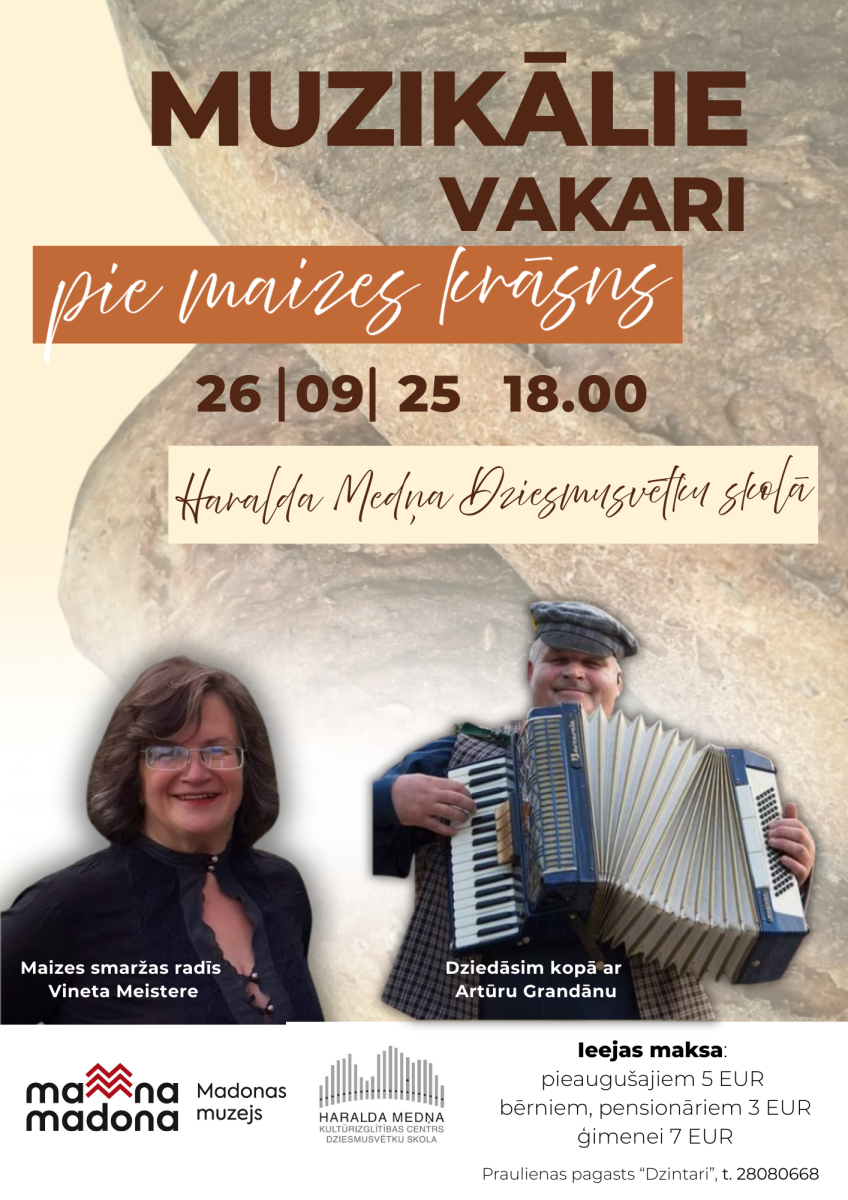 Šoruden turpinām mūsu viesu vidū iemīļoto un gaidīto pasākumu ciklu “Muzikālie vakari pie maizes krāsns”. Atkal kursim krāsni, vārīsim tēju, ieliesim medu māla podiņā, lai ir ko uz siltās maizītes patecināt, un aicināsim gan tuvus, gan tālus maizes cepējus. Kopā mācīsimies katras saimnieces maizes cepšanas paņēmienus, veidosim kukulīšus un šausim tos krāsnī. Muzikanti, folkloras kopas un vokālās grupas vadīs sadziedāšanos. Un ne tikai dziesmas vien – arī mīklas un prāta mežģi būs savu vietu atraduši šajos vakaros.