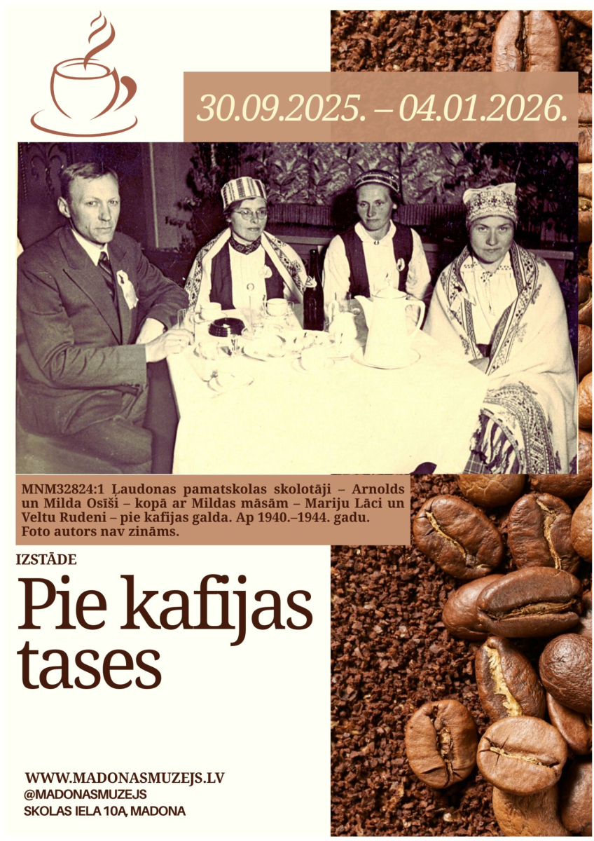 Svinot Starptautisko kafijas dienu, no 30. septembra Madonas novadpētniecības un mākslas muzeja Izstāžu zāļu foajē būs aplūkojama izstāde “Pie kafijas tases”, kurā varēs aplūkot ar kafiju saistītus priekšmetus no Madonas muzeja krājuma, teiksim, 19. gs. izgatavotas kafijas dzirnaviņas un "brennīzeri" (vācu val. “brennen” – dzedzināt, grauzdēt) – pannu grauzdēšanai. Lai saldinātu kafijas rūgto garšu, varēs iepazīties ar saldumu ražošanas vēsturi Rīgā un aplūkot saldumu ražotāju – Latvijas saldumu karaļa Vilhelmas Ķuzes (vēlāk “17. jūnijs”, “Staburadze”), “L.V. Goegginger” (nākamā “Uzvara”), fabrikas “Maķedonija” (vēlāk “Laima”), – produkcijas iepakojumus. Izstāde būs aplūkojama līdz 2026. gada 4. janvārim.
