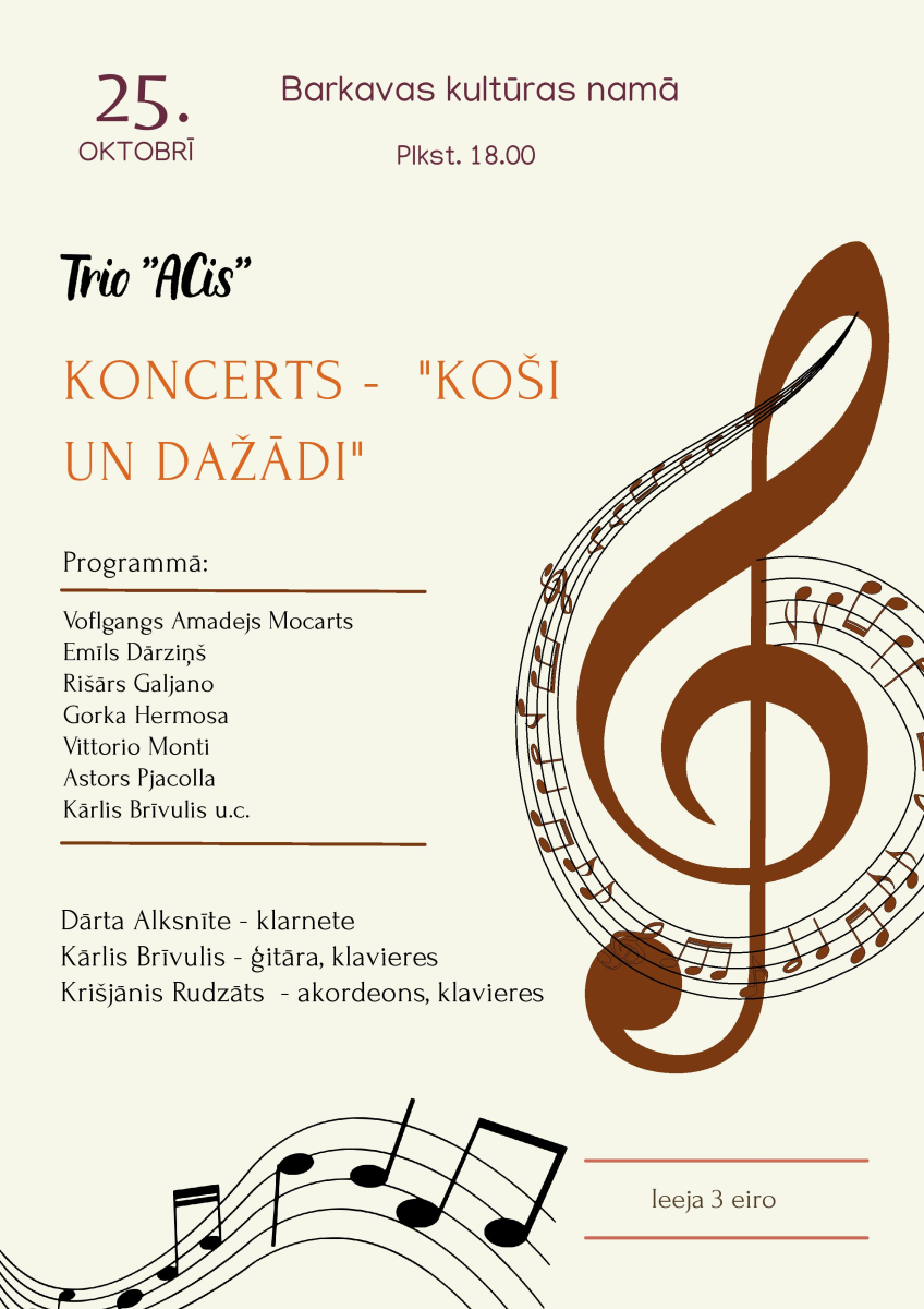 Katrs skaņdarbs ir kā stāsts par sajūtām, ceļojumiem un sapņiem. 25. oktobrī plkst. 18.00 Barkavas kultūras namā šos stāstus izdzīvos trio “ACis” koncertā “Koši un dažādi”. Programmā skanēs gan klasikas pērles, gan mūsdienu komponistu darbi. Nāc un pavadi rudens vakaru mūzikas noskaņās, ļaujot melodijām uzrunāt sirdi un piepildīt rudenīgo vakaru ar siltumu un krāsām. Īpašs prieks, ka viens no trio dalībniekiem – Krišjānis Rudzāts – ir barkavietis, kurš koncertēs uz vietējās skatuves. Tā būs lieliska iespēja satikt savu novadnieku un baudīt viņa talantu kopā ar izciliem mūziķiem.